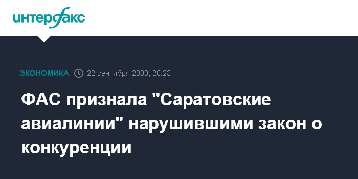 Москва. 22 сентября. INTERFAX.RU - Федеральная антимонопольная служба (ФАС) признала ОАО "Саратовские авиалинии" нарушившим закон о конкуренции, говорится в сообщении ФАС.