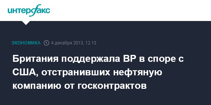 Лондон. 4 декабря. INTERFAX.RU - Правительство Великобритании выступило в поддержку BP Plc в споре с властями США о будущем нефтяной компании в этой стране, назвав "чрезмерным" запрет на новые контракты BP с федеральными властями, пишет газета Financial Times.