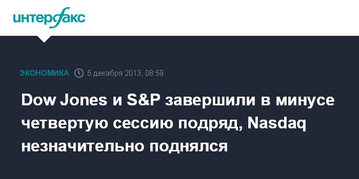 5 декабря. FINMARKET.RU - Торги в среду американские фондовые индексы Dow Jones Industrial Average и Standard & Poor's 500 завершили снижением, причем четвертую сессию подряд, что является самым длительным периодом падения индексов за 10 недель, сообщает Bloomberg. Nasdaq Composite показал незначительный подъем по итогам торгов.