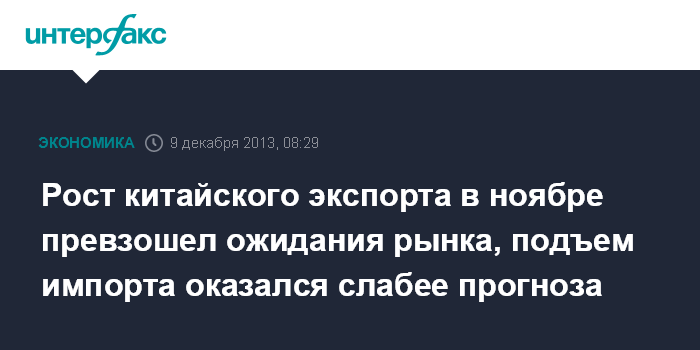 Данные таможенных органов свидетельствуют об увеличении экспортных поставок из КНР в США, Европу и Южную Корею. Усиление мирового спроса на китайские товары повышает вероятность того, что рост экономики КНР в этом году будет не меньше плановых 7,5% и точно превысит 7,2%, которые премьер китайского Госсовета Ли Кэцян назвал необходимыми для обеспечения стабильной занятости. Между тем в первые три квартала 2013 года экспорт не оказывал положительного влияния на экономику, уменьшив темпы роста ВВП на 1,7 процентного пункта.