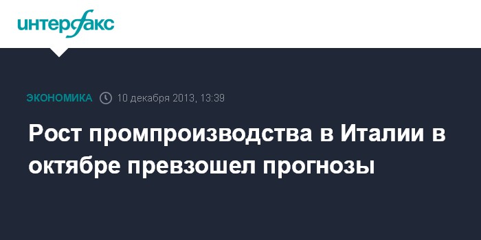 10 декабря. FINMARKET.RU - Объем промышленного производства в Италии в октябре 2013 года вырос на 0,5% по сравнению с предыдущим месяцем, когда его повышение составило 0,2%, свидетельствуют данные итальянского статистического агентства Istat.