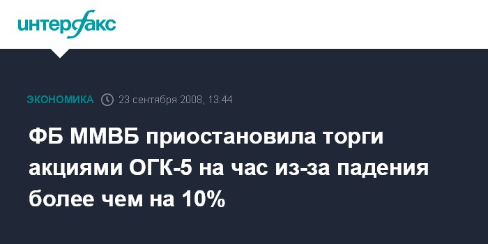 ФБ ММВБ приостановила торги акциями ОГК-5 на час из-за падения более чем на 10%