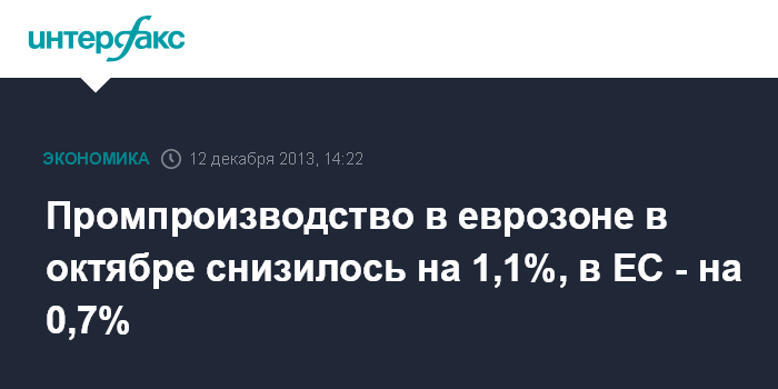 12 декабря. FINMARKET.RU - Объем промышленного производства в еврозоне в октябре 2013 года упал на 1,1% по сравнению с предыдущим месяцем, когда его снижение составляло 0,2%, свидетельствуют данные Статистического управления Европейского союза (Eurostat). Октябрьское сокращение оказалось самым значительным с сентября 2012 года.
