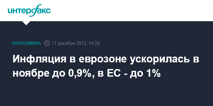 17 декабря. FINMARKET.RU - Инфляция в ноябре 2013 года в еврозоне в годовом исчислении ускорилась до 0,9% после 0,7% в октябре, свидетельствуют окончательные данные Статистического управления Европейского союза.