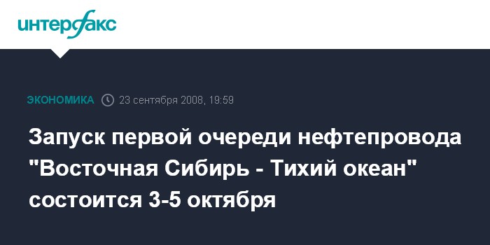 Москва. 23 сентября. INTERFAX.RU - Запуск первой очереди нефтепровода Восточная Сибирь - Тихий океан" в реверсном режиме может состояться 3-5 октября 2008 года, сообщил Агентству нефтяной информации (АНИ) вице-президент компании Михаил Барков.