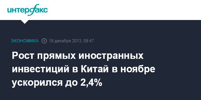 18 декабря. FINMARKET.RU - Прямые иностранные инвестиций в экономику Китая в ноябре 2013 года выросли на 2,4% в годовом выражении по сравнению с 1,2% месяцем ранее, передает агентство "Синьхуа" со ссылкой на данные министерства торговли КНР.