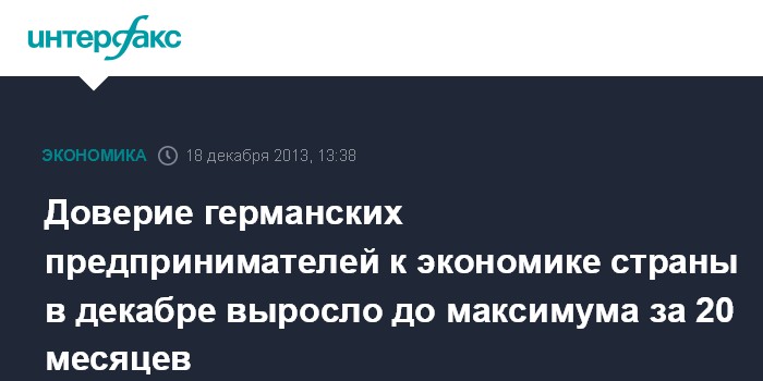 18 декабря. FINMARKET.RU - Индекс доверия германских предпринимателей к экономике страны вырос в декабре 2013 года до 109,5 пункта со 109,3 пункта в ноябре, свидетельствуют данные исследовательского института IFO.