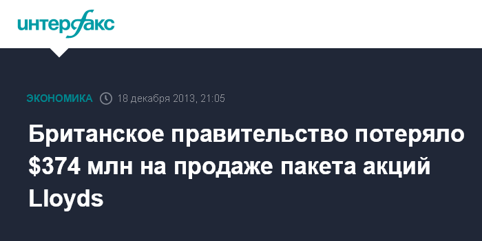 Москва. 18 декабря. INTERFAX.RU - Правительство Великобритании получило убыток в размере 230 млн фунтов стерлингов ($374 млн) в результате продажи первого пакета принадлежащих ему акций Lloyds Banking Group Plc, крупнейшего розничного банка страны, сообщило агентство Bloomberg со ссылкой на данные Счетной палаты Великобритании (NAO).