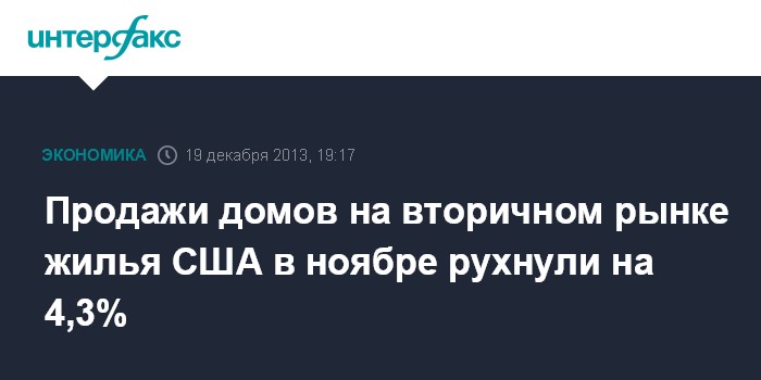19 декабря. FINMARKET.RU - Продажи домов на вторичном рынке жилья в США в ноябре 2013 года упали на 4,3% по сравнению с предыдущим месяцем - до 4,9 млн домов в пересчете на годовые темпы, минимального уровня с декабря 2012 года, говорится в отчете Национальной ассоциации риэлторов.