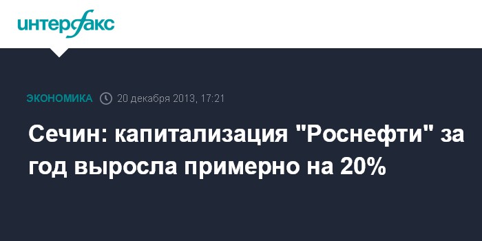 Москва. 20 декабря. INTERFAX.RU - Капитализация компании "Роснефть" в 2013 году выросла примерно на 20%, сообщил глава компании Игорь Сечин на встрече с президентом РФ Владимиром Путиным.