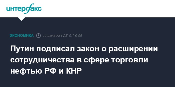 Федеральным законом ратифицируется соглашение между правительством РФ и правительством КНР о расширении сотрудничества в сфере торговли нефтью, подписанное 22 марта 2013 г. в Москве.
