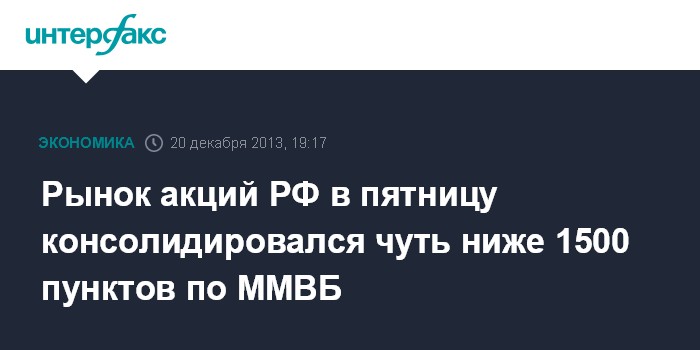 Москва. 20 декабря. INTERFAX.RU - Российский рынок акций в пятницу консолидировался в районе 1500 пунктов по индексу ММВБ при разнополярной динамике цен blue chips из-за фиксации прибыли игроками после недельного ралли; локальный оптимизм спекулянтов на новостях об освобождении экс-главы "ЮКОСа" Михаила Ходорковского быстро сошел на нет.