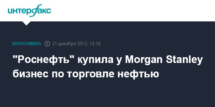 Москва. 21 декабря. INTERFAX.RU - Американский банк Morgan Stanley сообщил вечером в пятницу, что продал российской "Роснефти" подразделение, занимающееся торговлей нефтью, а также ее хранением и транспортировкой. Финансовая сторона сделки не разглашается.