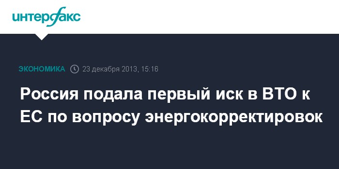 Москва. 23 декабря. INTERFAX.RU - Россия в понедельник подала первый иск во Всемирную торговую организацию к ЕС по так называемому вопросу энергокорректировок при проведении антидемпинговых расследований, сообщил "Интерфаксу" источник в Минэкономразвития.