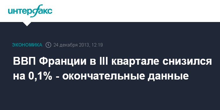 24 декабря. FINMARKET.RU - Объем ВВП Франции в третьем квартале 2013 года сократился на 0,1% по сравнению с предыдущим кварталом, свидетельствуют окончательные данные национального статистического управления Insee.