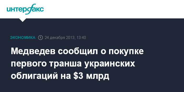 Москва. 24 декабря. INTERFAX.RU - Премьер-министр РФ Дмитрий Медведев сообщил, что Россия в понедельник, 23 декабря, приобрела первый транш украинских суверенных облигаций на сумму в 3 млрд долларов.
