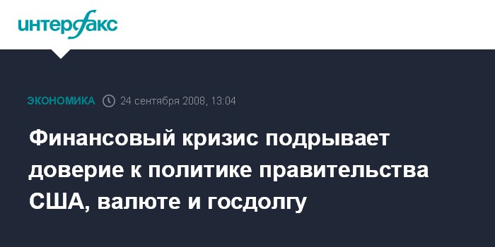 Москва. 24 сентября. INTERFAX.RU - Финансовый кризис, охвативший мировые рынки, уже оставил свой разрушительный след, однако самой серьезной проблемой может оказаться вопрос доверия американскому правительству, доллару и долговым обязательствам казначейства США, пишет газета International Herald Tribune.