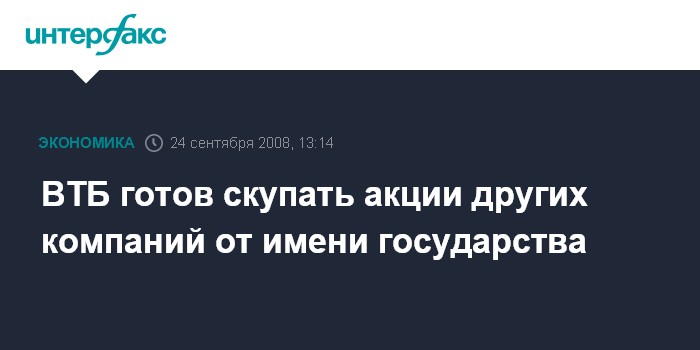 Москва. 24 сентября. INTERFAX.RU - ВТБ готов выступить агентом государства по скупке акций других компаний, сообщил член правления, руководитель финансового департамента ВТБ Николай Цехомский в среду в беседе с журналистами.
