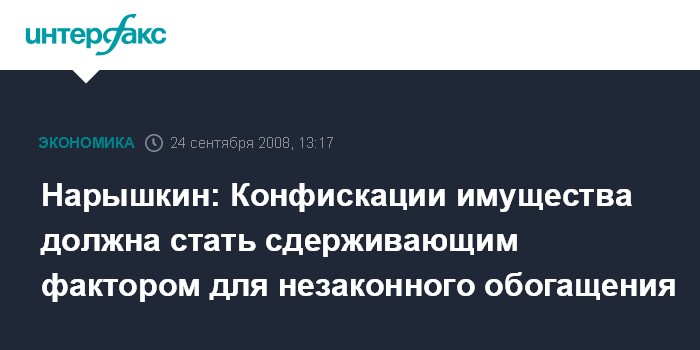 Москва. 24 сентября. INTERFAX.RU - Глава администрации президента РФ Сергей Нарышкин заявляет, что одним из приоритетов в борьбе с коррупцией должна стать конфискация незаконно нажитого имущества.