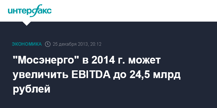Москва. 25 декабря. INTERFAX.RU - ОАО "Мосэнерго" в 2014 г. может получить EBITDA в размере 24,5 млрд руб., следует из прогноза в материалах ООО "Газпром энергохолдинг" к встрече с инвесторами.