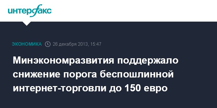 Москва. 26 декабря. INTERFAX.RU - Минэкономразвития поддерживает снижение порога для беспошлинной интернет-торговли до 150 евро, заявил журналистам замглавы министерства Алексей Лихачев в четверг в Москве.