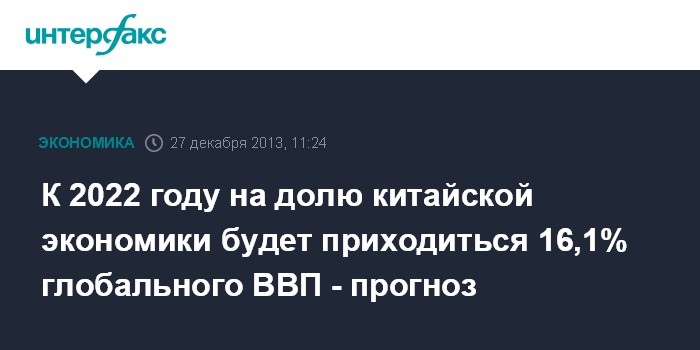 К 2022 году на долю китайской экономики будет приходиться 16,1% глобального ВВП - прогноз