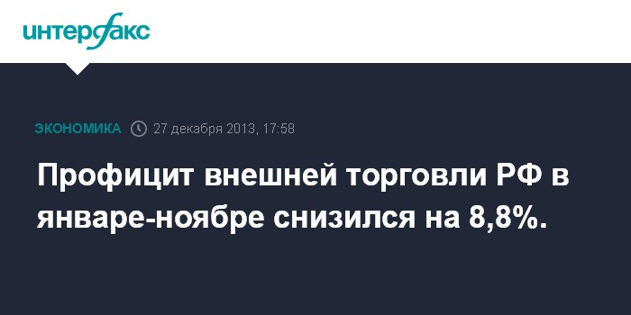 Положительное сальдо торгового баланса в январе-ноябре составило $160,4 млрд по сравнению с $175,9 млрд за январь-ноябрь прошлого года. Таким образом, профицит внешней торговли РФ снизился на 8,8%.