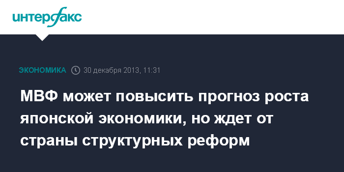 30 декабря. FINMARKET.RU - Международный валютный фонд (МВФ), вероятно, повысит прогноз роста ВВП Японии, однако стране стоит начать бюджетные, а также структурные реформы в 2014 году, заявил в интервью Financial Times заместитель директора-распорядителя МВФ Дэвид Липтон.