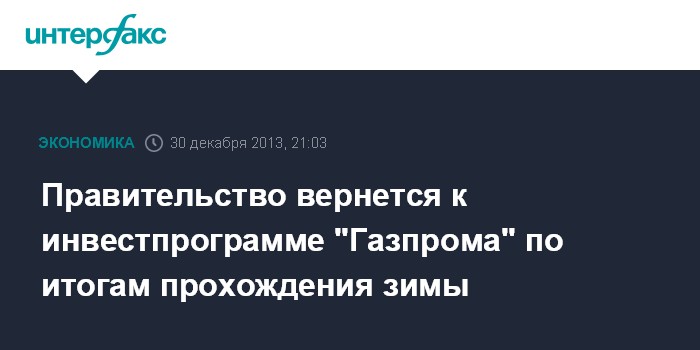 Москва. 30 декабря. INTERFAX.RU - Правительство России, вернувшееся к обсуждению инвестиционной программы "Газпрома" на уровне кабинета министров в декабре 2012 года после десятилетнего перерыва, может вновь вернуться к ее обсуждению уже по итогам прохождения осенне-зимнего максимума.