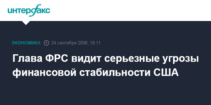 Москва. 24 сентября. INTERFAX.RU - Глава Федеральной резервной системы (ФРС) Бен Бернанке заявил, что США стоят перед серьезной угрозой финансовой стабильности, предупредив, что кредитный кризис начал наносить ущерб расходам домохозяйств и бизнеса, сообщило агентство Bloomberg.