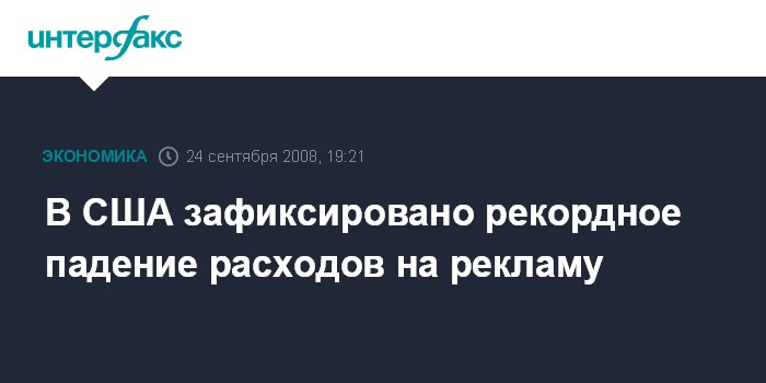 Москва. 24 сентября. INTERFAX.RU - Падение расходов на рекламу в США во втором квартале составило 3,7% по сравнению с аналогичным периодом прошлого года, что стало рекордным снижением с 2001 г., сообщило агентство Bloomberg.
