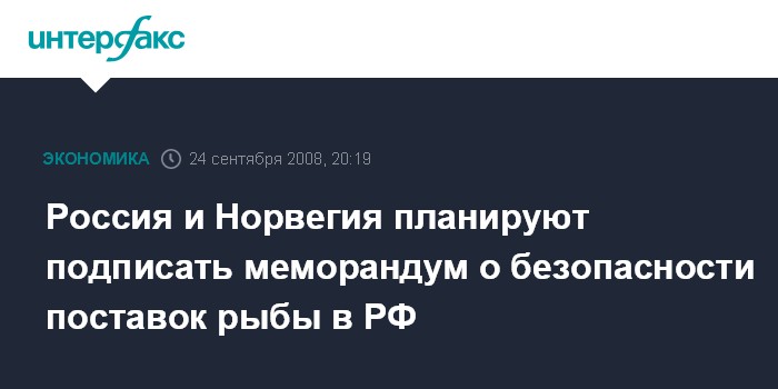 Москва. 24 сентября. ИНТЕРФАКС - Россия и Норвегия планируют подписать специальный меморандум, гарантирующий безопасность поставок рыбы и рыбной продукции из Норвегии в РФ.