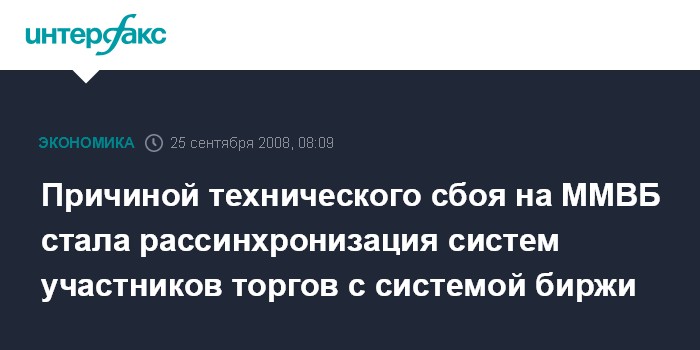 Москва. 25 сентября. INTERFAX.RU - Причиной технического сбоя на ММВБ, который произошел 24 сентября, стала рассинхронизация систем у ряда участников торгов с основной системой биржи, сообщили агентству "Интерфакс-АФИ" на ММВБ.