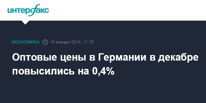 14 января. FINMARKET.RU - Оптовые цены в Германии в декабре 2013 года выросли на 0,4% по сравнению с предыдущим месяцем, когда их снижение составляло 0,2%, свидетельствуют данные Федерального статистического управления ФРГ (Destatis).
