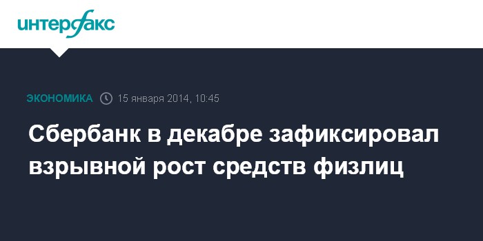 Согласно сообщению Сбербанка, средства физических лиц в декабре увеличились на 644 млрд рублей и составили 8,04 трлн рублей. В результате прирост этого показателя за 2013 год составил 20,6%, больше, чем в 2012 году (17,4%).
