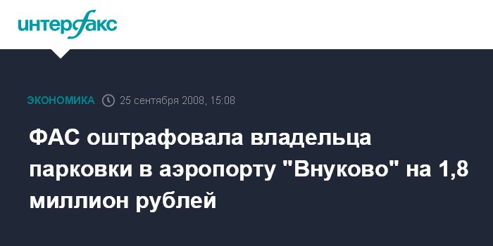Москва. 25 сентября. INTERFAX.RU - Федеральная антимонопольная служба РФ (ФАС) оштрафовала ЗАО "Внуково-Инвест" за злоупотребление доминирующим положением на рынке оказания услуг парковки на сумму 1 млн 786 тыс. рублей, говорится в сообщении ФАС.