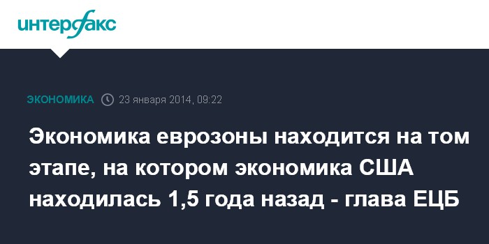 Как сказал глава ЕЦБ, теперь восстановление еврозоны поддерживает не только экспорт, но и внутренний спрос. Экономика еврозоны находится в настоящее время на том этапе, на котором экономика США находилась 1,5 года назад, добавил он.