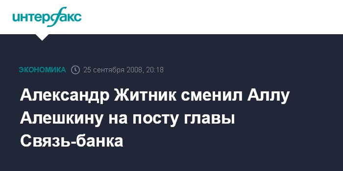 Москва. 25 сентября. NTERFAX.RU - Совет директоров Связь-банка в четверг принял решение о досрочном прекращении полномочий президента-председателя правления Аллы Алешкиной и об избрании на эту должность Александра Житника, сообщается в пресс-релизе банка.