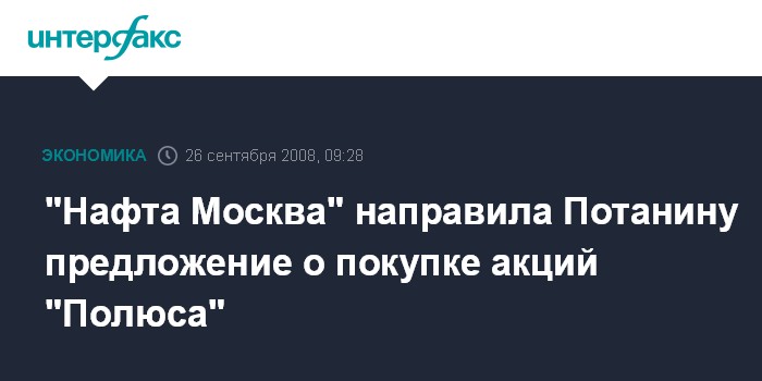 Москва. 26 сентября. INTERFAX.RU - "Нафта Москва" Сулеймана Керимова, которая до весны этого года являлась основным акционером "Полиметалла", направила владельцу "Интерроса" Владимиру Потанину" предложение о покупке его пакета в ОАО "Полюс Золото".