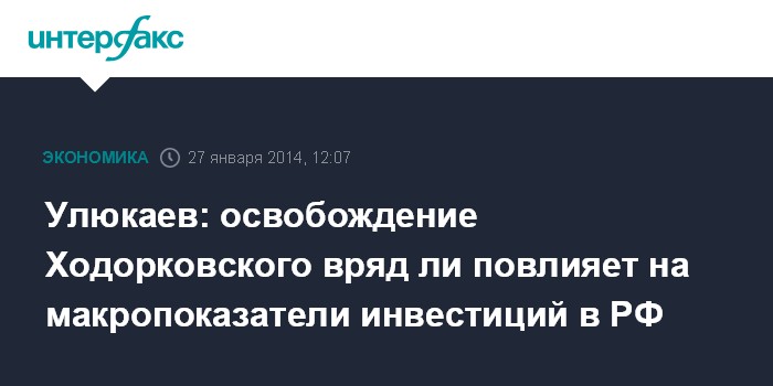 "Вряд ли на прикладной показатель (такой, как рост инвестиций в основной капитал - ИФ) они (последние политические события, включая освобождение Михаила Ходорковского - ИФ) повлияют. Это в целом создание более благоприятной среды, социальной, правовой, культурной, политической, которая так или иначе оценивается всеми участниками процесса. Помочь в принятии решения о конкретных инвестициях они вряд ли смогут. Не думаю, что это имеет макроэкономический смысл", - сказал министр в интервью "Интерфаксу" в кулуарах Всемирного экономического форума в Давосе.