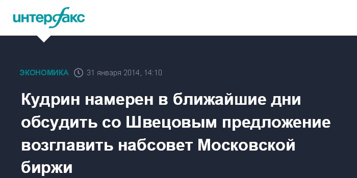 Москва. 31 января. INTERFAX.RU - Экс-министр финансов РФ Алексей Кудрин обсудит с первым заместителем председателя Банка России - руководителем службы Банка России по финансовым рынкам Сергеем Швецовым предложение возглавить наблюдательный совет Московской биржи в ближайшие дни. Об этом агентству "Интерфакс" сообщил сам Кудрин.