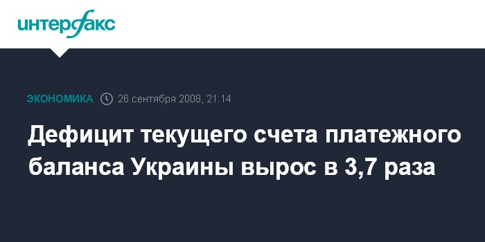 Москва. 26 сентября. INTERFAX.RU - Дефицит текущего счета платежного баланса Украины в январе-августе 2008 года возрос в 3,7 раза по сравнению с аналогичным периодом 2007 года - до $7,5 млрд, или 6% ВВП, такие предварительные данные сообщил Нацбанк Украины (НБУ) в пятницу.