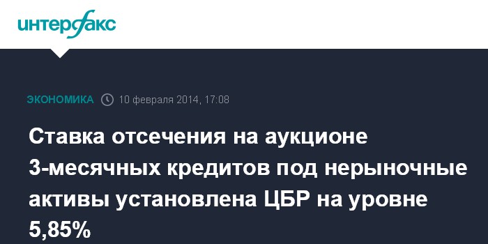 Ставка отсечения на аукционе 3-месячных кредитов под нерыночные активы установлена ЦБР на уровне 5,85%