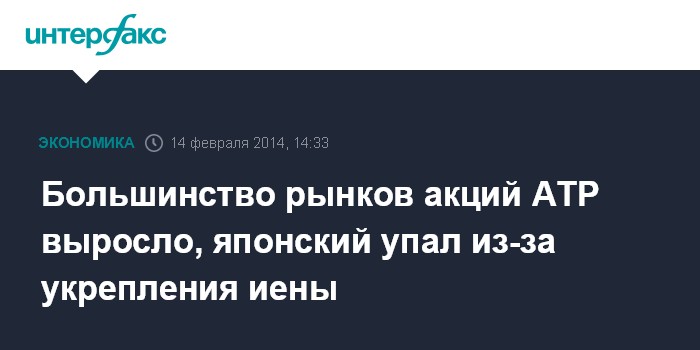 14 февраля. FINMARKET.RU - Торги в пятницу большинство фондовых индексов Азиатско-Тихоокеанского региона завершило ростом, тогда как японский фондовый рынок упал на фоне укрепления иены, которое обусловили слабые статданные из США, отмечает Bloomberg.