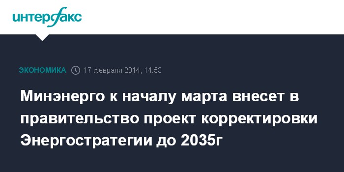 Москва. 17 февраля. INTERFAX.RU - Минэнерго планирует к началу марта внести в правительство проект корректировки Энергостратегии до 2035г, сообщил заместитель министра энергетики Алексей Текслер в ходе обсуждение проекта документа.
