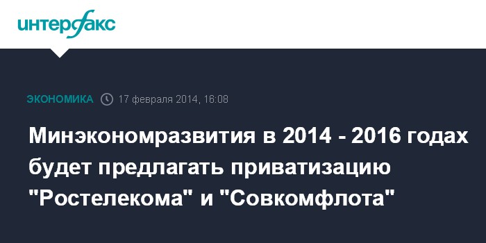 Минэкономразвития в 2014 - 2016 годах будет предлагать приватизацию "Ростелекома" и "Совкомфлота"