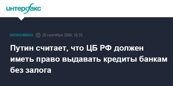 "Предлагается разрешить Центральному банку выдавать кредиты коммерческим организациям без залогов - это позволит в сжатые сроки поддержать банковский рынок необходимой ликвидностью", - заявил В.Путин на совещании в правительстве, посвященном концепции долгосрочного развития РФ до 2020 года.