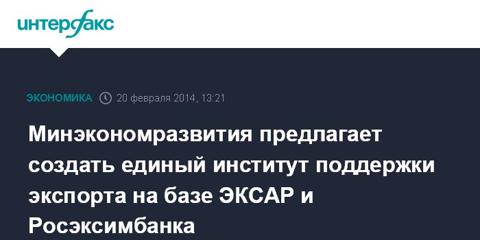 Москва. 20 февраля. INTERFAX.RU - Минэкономразвития предлагает в рамках ВЭБа создать единый институт поддержки экспорта на базе ЭКСАР (Российское агентство по страхованию экспортных кредитов и инвестиций) и Росэксимбанка, заявил министр экономического развития Алексей Улюкаев, выступая на заседании правительства по вопросу поддержки несырьевого экспорта.