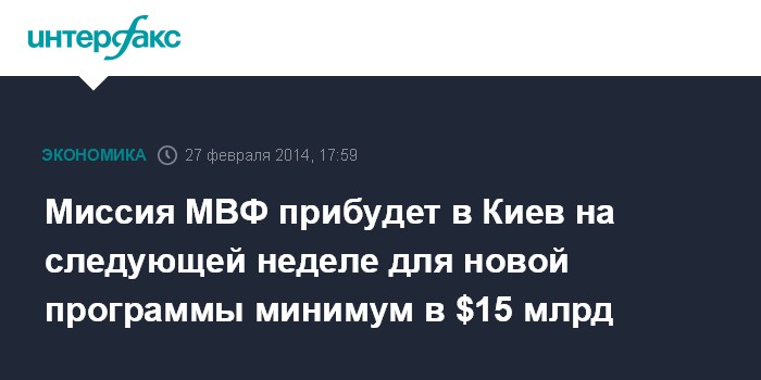 Киев. 27 февраля. INTERFAX.RU - Новое украинское правительство обратилось к Международному валютному фонду (МВФ) с просьбой в оперативном порядке направить миссию для подготовки новой программы финансовой помощи stand by, объем которой украинское правительство оценивает минимум в $15 млрд, сообщил министр финансов Александр Шлапак.