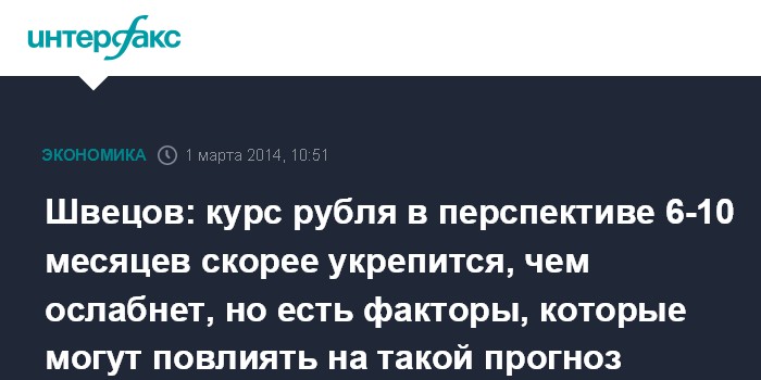 Москва. 1 марта. INTERFAX.RU - Рубль в перспективе 6-10 месяцев имеет больше шансов на укрепление, чем на ослабление, но есть факторы, которые могут повлиять на курс, считает первый зампред ЦБ Сергей Швецов.